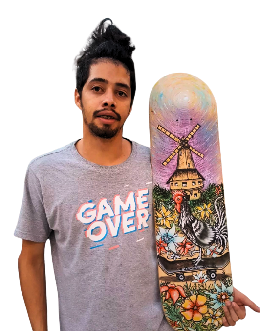 Graffiti: Foi através do graffiti que iniciei meu contato com a arte. Desde então, realizo paineis muralistas e recentemente fiz os pontos turísticos de Joinville no Skate Club.